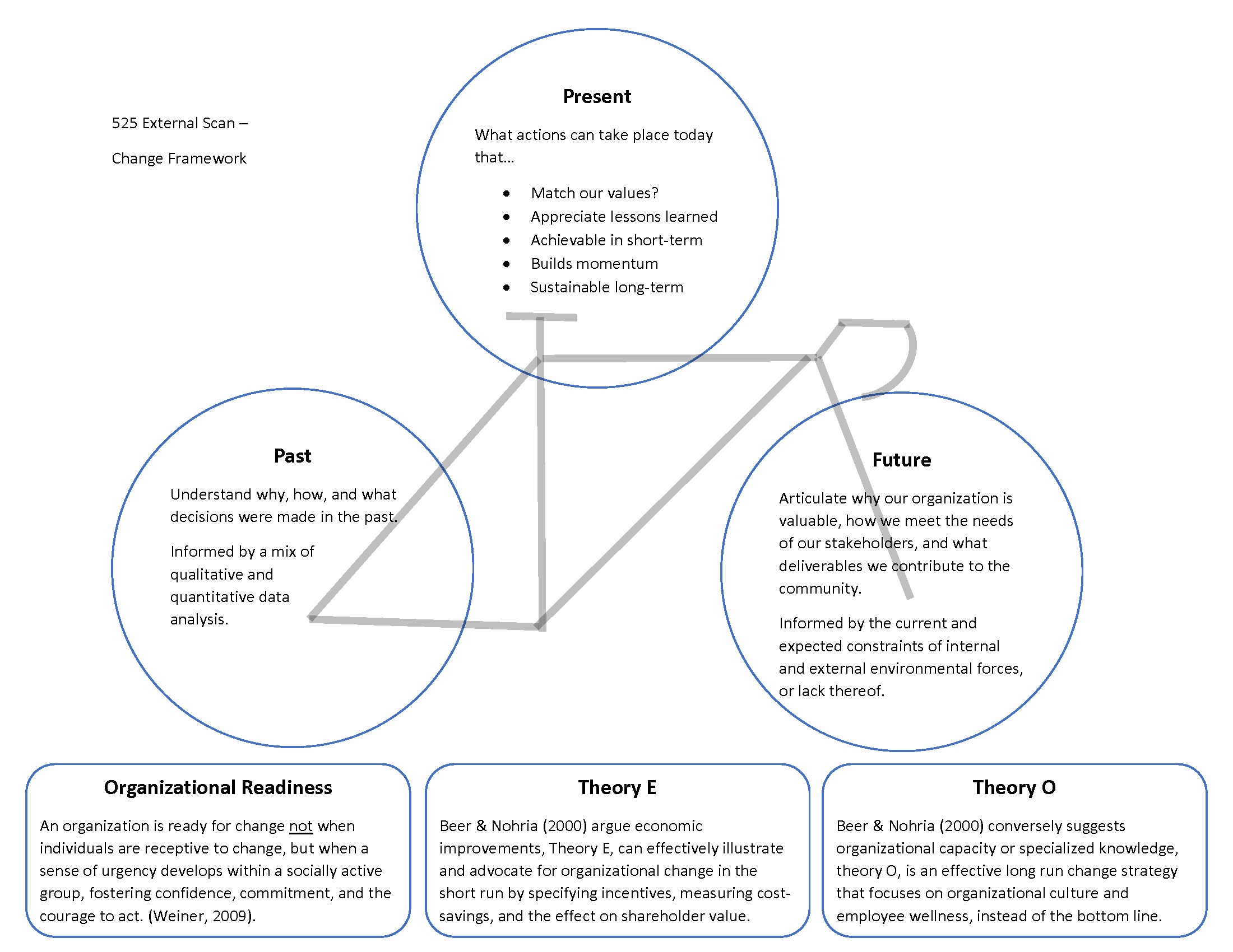 Visually representing change models is challenging. Indeed, our societies have tried to illustrate this required balance of perspective and action for thousands of years. This assignment incorporates qualitative views of stakeholders from the sports coaching community and reflects on their experiences facilitating change at non-profit organizations. Effective leadership and change management require a well-developed understanding of historical factors, future possibilities, and the modes that propel individuals within organizations to champion necessary innovation and development.