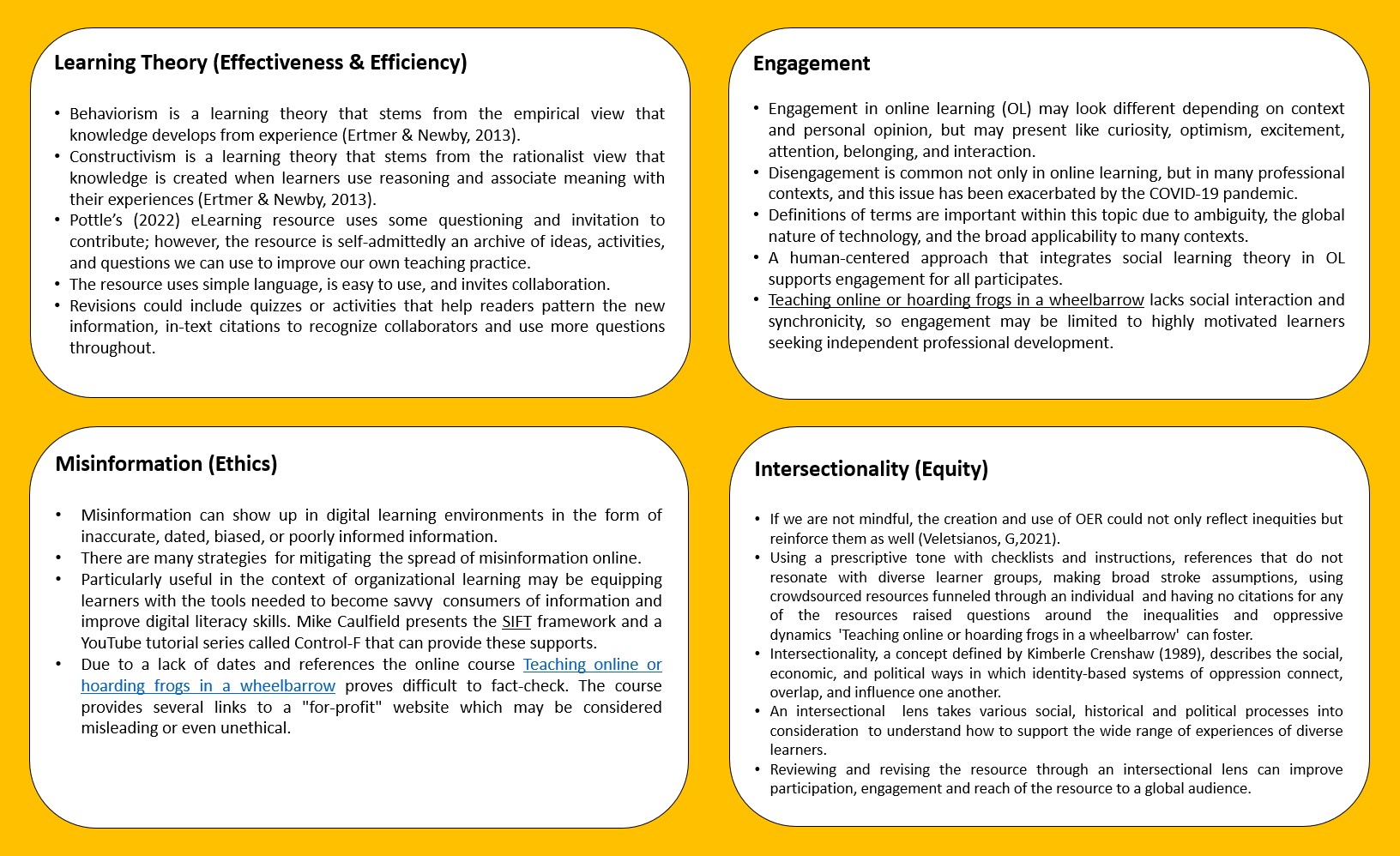 Team 4 analyzed Pottle’s (2022) eLearning teacher resource, Teaching online or hoarding frogs in a wheelbarrow, with an appreciation for Veletsianos’s (2021) four tenets of online and blended learning environments. The infographic below showcases each team member’s assessment of the eLearning’s efficiency & effectiveness, ability to engage, and systemic awareness of ethics and equity. The image following it represents the interconnected nature of our inquiry.
